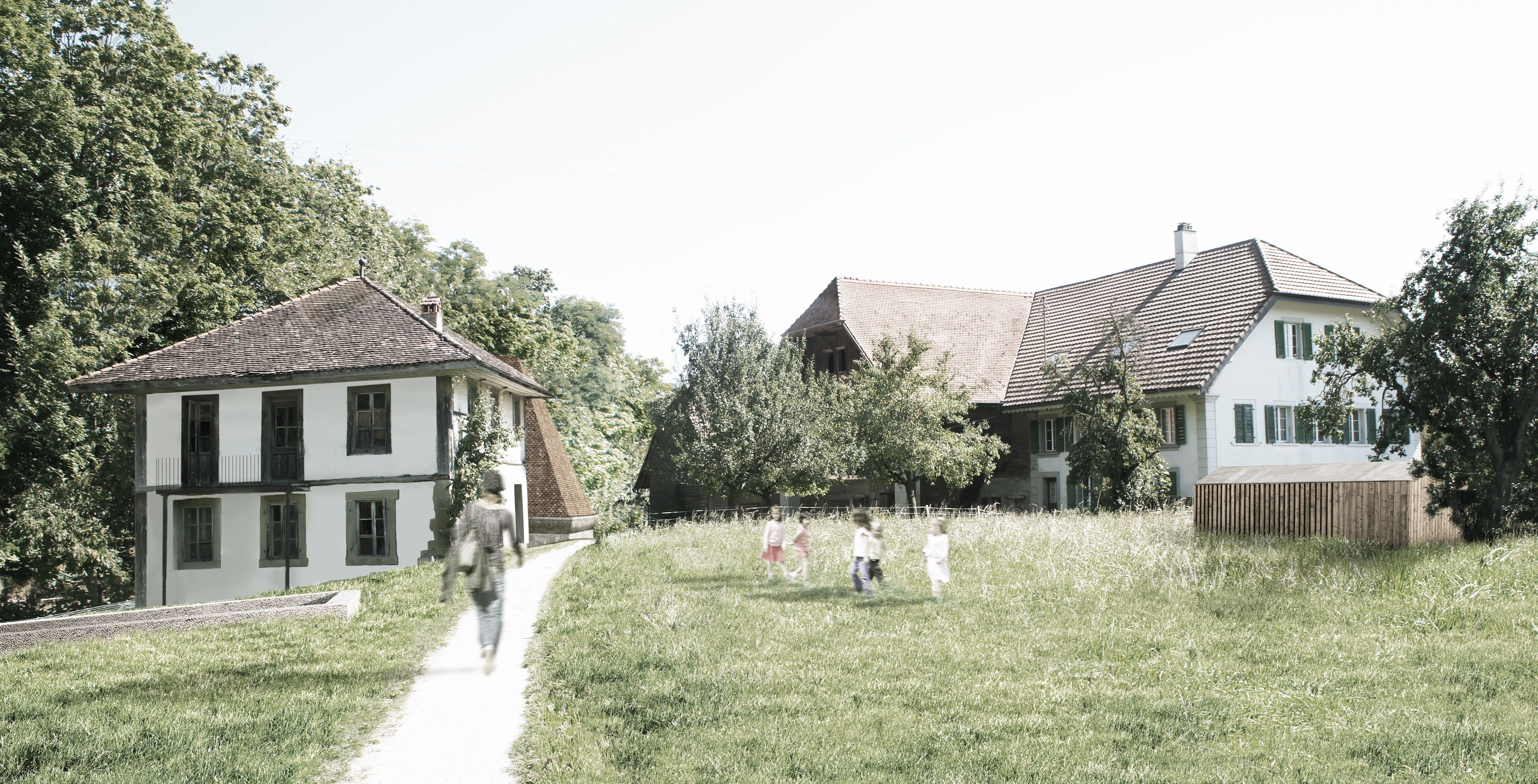 Dans le volume du rural de la grande ferme prend place un espace communautaire, permettant ainsi la conservation et la mise en évidence de l'ensemble de la structure. De par son volume généreux, il pourrait également être mis à disposition des autres habitants du village.