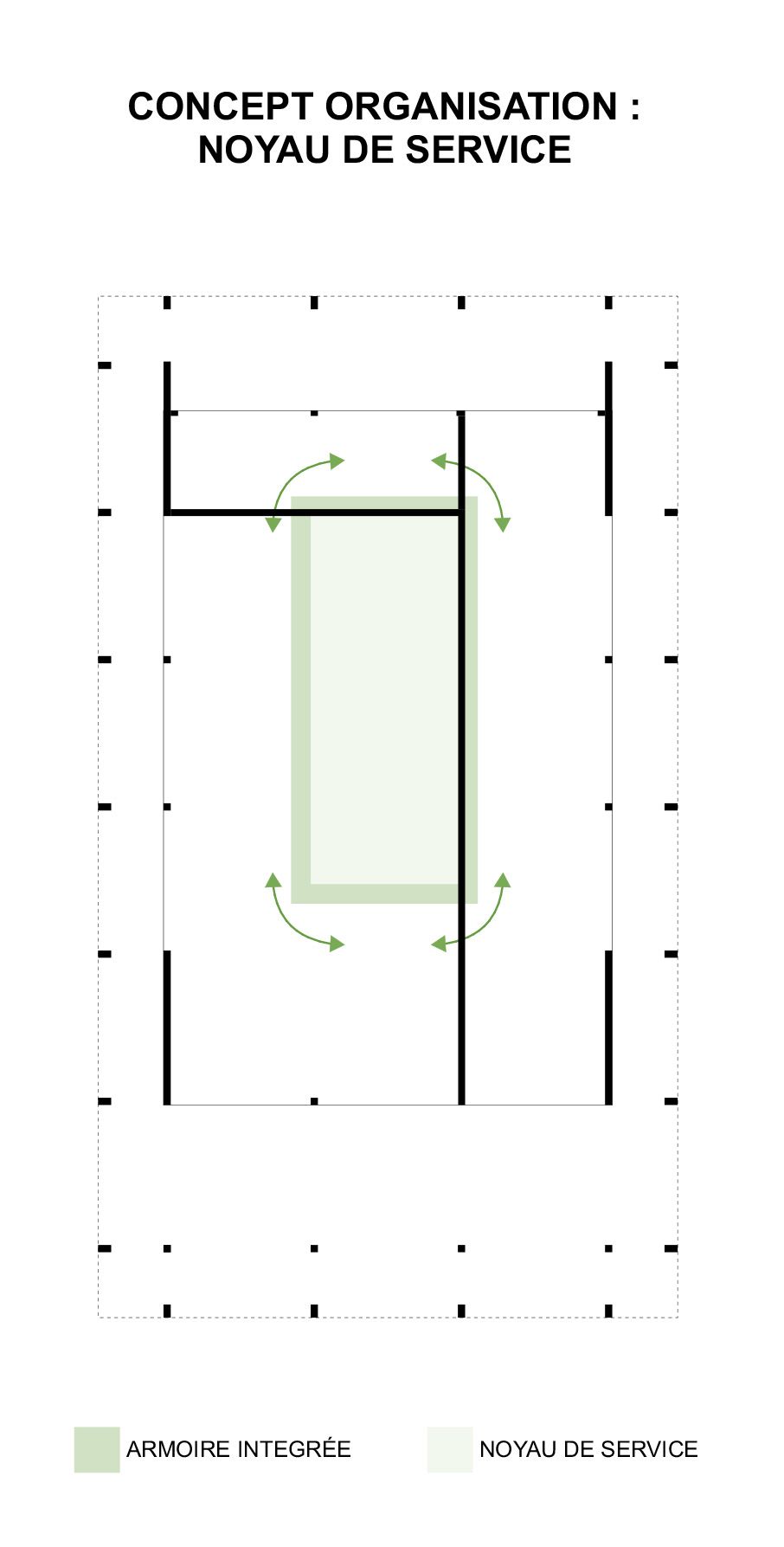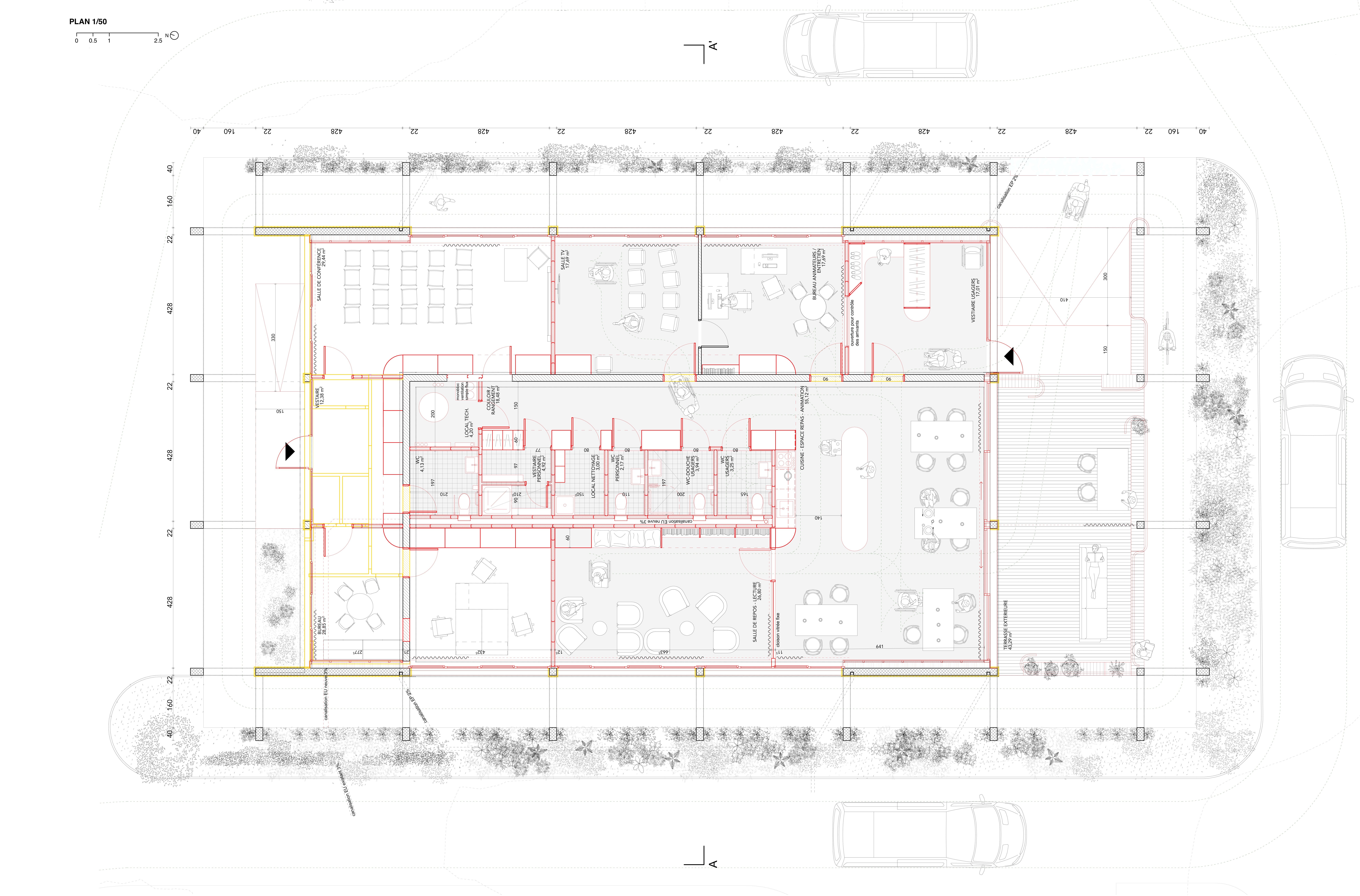 Le partitionnement intérieur actuel a été conservé dans la mesure du possible, limitant ainsi les travaux lourds. Les deux murs porteurs en briques sont conservés, délimitant un noyau de services central. Des percements y sont prévus pour faciliter la circulation. Une armoire périphérique vient habiller ce noyau fonctionnel ; elle se distingue par sa matérialité et sa couleur, offrant un repère rassurant pour les usagers. Ses compartiments s’adaptent aux besoins des espaces. L’intérieur de ce noyau se distingue également par une matérialité spécifique : un carrelage en grès cérame recouvre sol et murs, assurant durabilité, facilité d’entretien et une esthétique sobre.