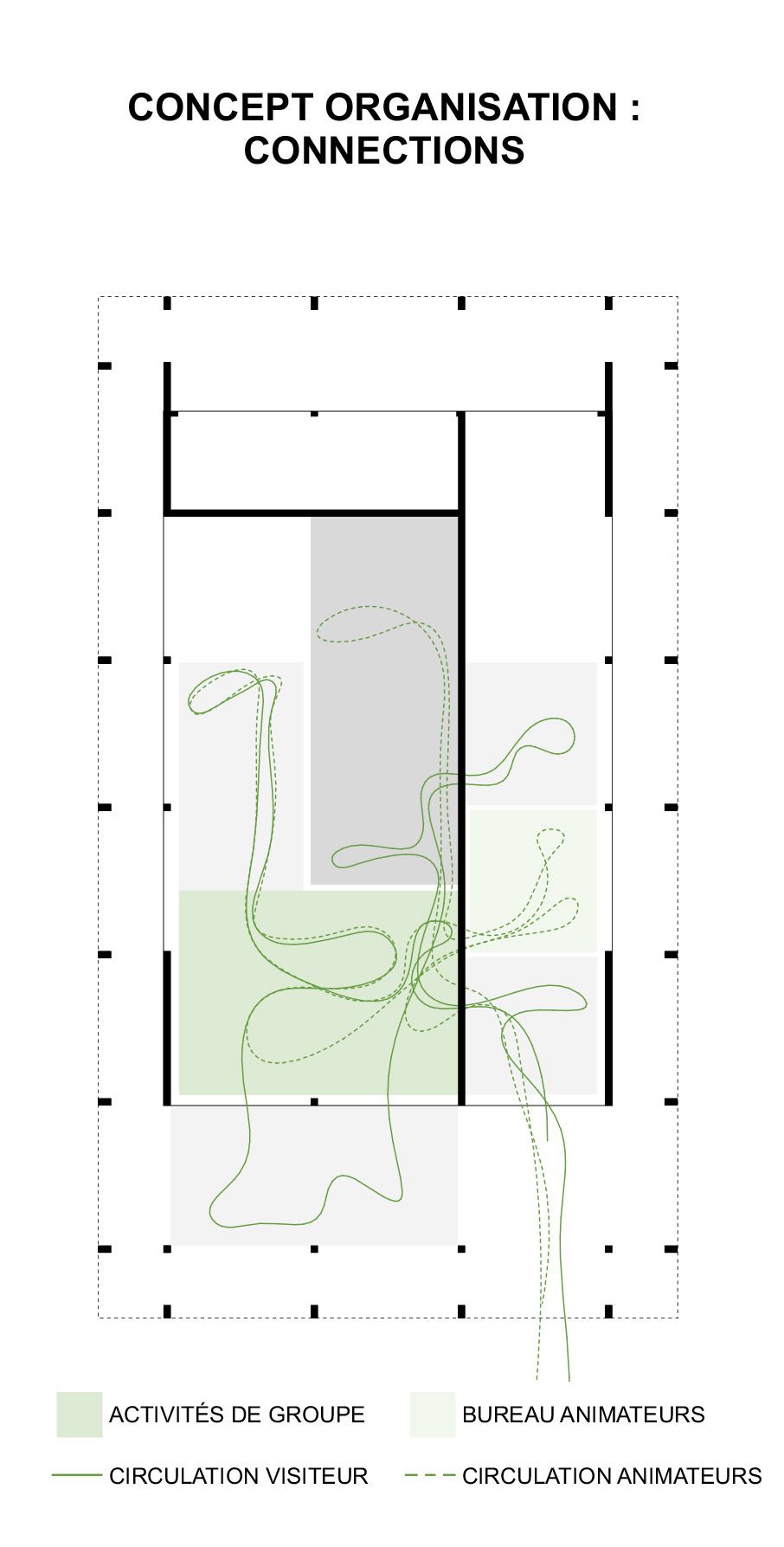 La salle d’activités, pièce maîtresse du pavillon, dessert toutes les autres zones. Elle est liée à la salle de repos par une cloison mobile, permettant leur transformation en un grand espace en cas de besoin. Le bureau des animateurs, situé à proximité, permet des échanges directs avec les visiteurs et assure le contrôle du vestiaire, garantissant une meilleure gestion des flux et une communication efficace.